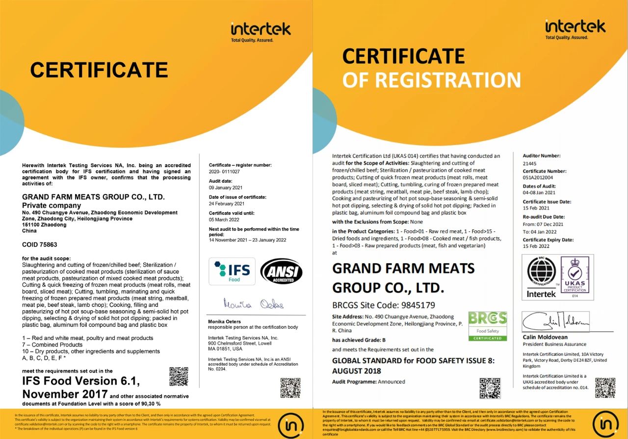 2021年2月25日,大莊園順利通過BRCGS(食品安全全球標準)、IFS(國際食品標準)兩大國際食品標準認證,成為國內畜類及牛羊肉行業第一家通過歐洲國際雙體系質量認證的企業。